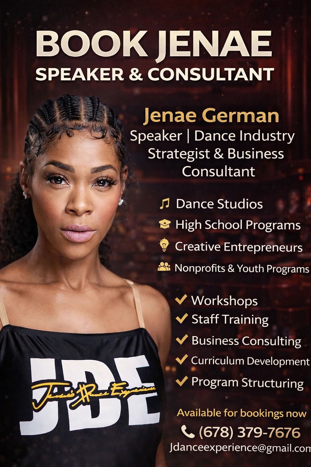 Jenae German is a dynamic speaker, dance industry strategist, and business consultant with over 20 years of experience transforming dancers into disciplined artists and creative entrepreneurs into structured, profitable brands. How can I be of service?